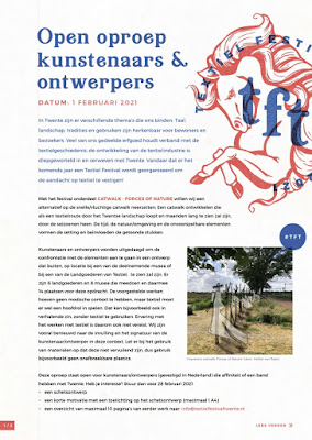 Naar buiten, is dat zo bijzonder? Ja, voor mij is het zeer bijzonder, ik ga een weerbestendig werkstuk maken. De aanleiding is een oproep van het Textielfestival Twente. Natuurlijk best wel heftig, maar het is leuk, leerzaam en een uitdaging.