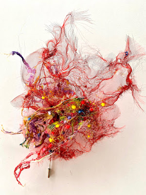 Het speldje is een jubileum cadeautje van 40 jaar Vezel. De abonnees werden vorig jaar uitgedaagd om dit kale speldje te versieren en te dragen tijdens het Textielfestival in Leiden.Het speldje ligt nog steeds op mijn werktafel en voor een beetje feestgevoel en mijn creativiteit te stimuleren ga ik er mee aan de slag.
